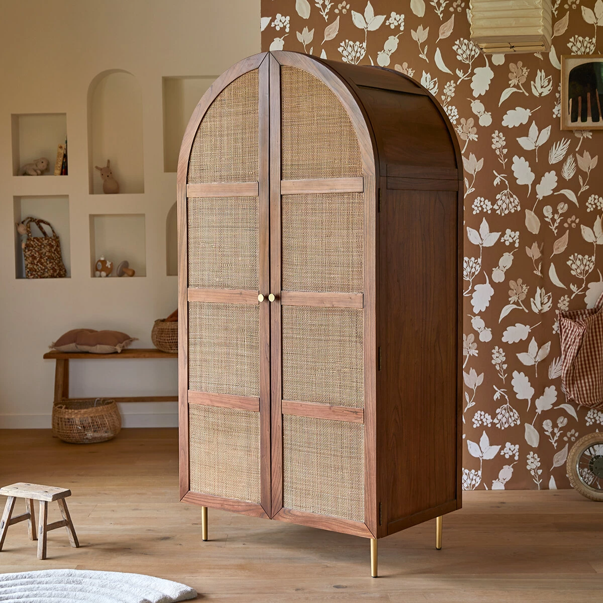 Tout en rondeur et en douceur, l’armoire en orme et cannage Lisbeth invite les enfants à la rêverie et les encourage à ranger leurs affaires, qu’il s’agisse de vêtements ou de jouets : derrière la porte, se cacherait-il le fascinant parapluie parlant de Mary Poppins ? C’est tellement mieux d’apprendre à ranger en s’amusant !