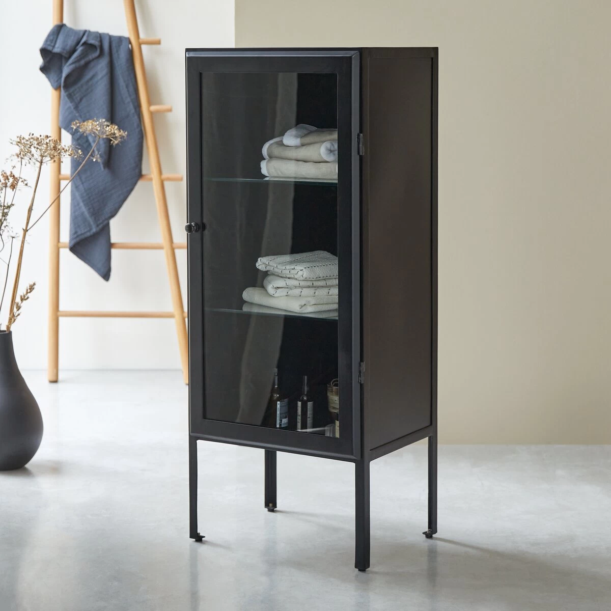 Vous apprécierez le côté très pratique de sa porte vitrée qui permet de retrouver facilement ce dont on a besoin et de mettre en valeur de jolis objets ou une pile de serviettes aux couleurs assorties.