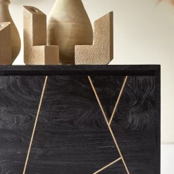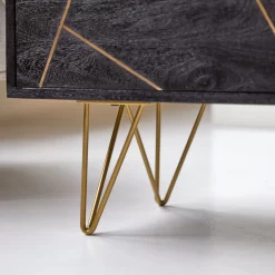 Vous serez séduit par son élégance, caractérisée par les pieds épingles en métal ainsi que les lignes ornées de métal peint en couleur laiton qui habillent les façades en manguier.