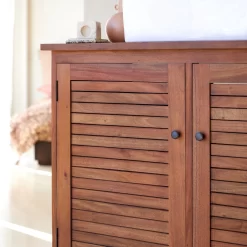 Le meuble de salle de bain en acacia massif certifié FSC® Loggia 97 offre l’authenticité d’un bois massif aux tonalités flamboyantes et le côté graphique de portes lamellées.