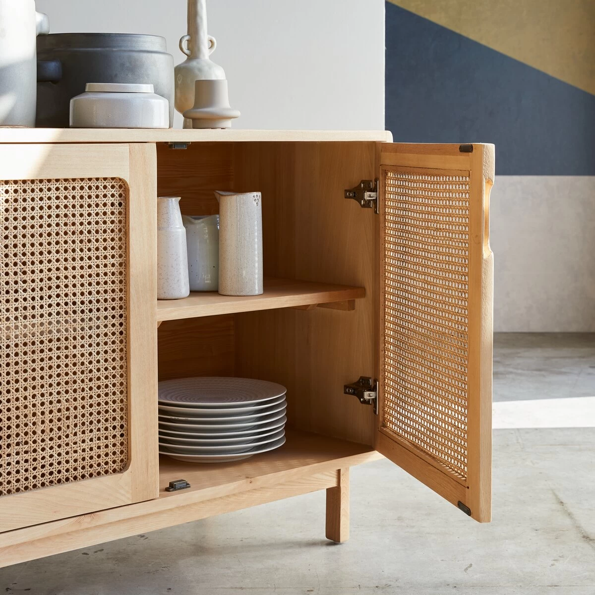 Le buffet en orme massif et cannage Luis trouve sa place dans toutes les pièces de la maison : offrant un généreux volume et assemblé de manière traditionnelle par queue droite, il reçoit vaisselle et linge de table au séjour et à la cuisine, vêtements ou linge de lit dans la chambre, dossiers et autres indispensables dans le bureau… Huilé pour être facile à vivre.
