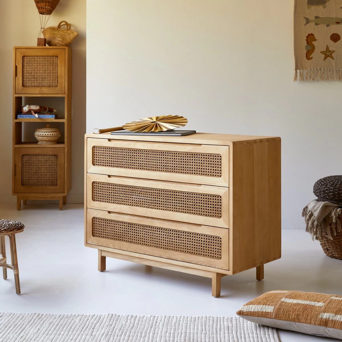 Ranger peut devenir un jeu avec la commode en orme massif et cannage Luis. D’inspiration exotique, elle compose un univers propice au rêve et à l’imaginaire. L’enfant devient aventurier dans une jungle lointaine… il joue, invente, explore, laisse parler son imagination et apprend à organiser son espace en rangeant ses affaires.