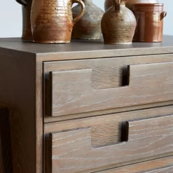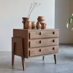 L’art de composer un intérieur tout en délicatesse… la commode en pin recyclé et chêne Madi fait partie de ces beaux meubles dont on salue le supplément d’âme. Ecoresponsable et de qualité premium, elle offre un design, entre Arty et neo ethnique, à la finesse poétique peu commune. Influencée par des horizons lointains, elle affiche un langage visuel créatif qui illumine le séjour, la chambre ou l’entrée et souligne le caractère très personnel de votre décoration intérieure. On ne se lasse pas d’admirer ses finitions : le piétement semble délicatement posé sur les flancs du meuble, les tiroirs jouent les fausses vraies poignées, les veines apparentes lui confèrent une étonnante singularité.