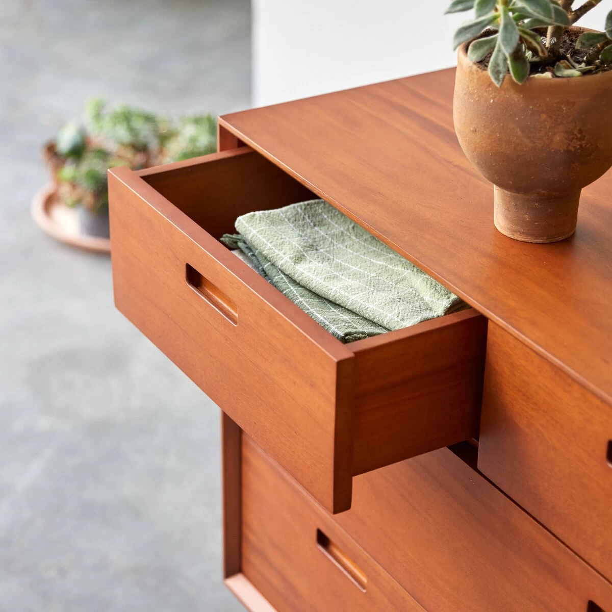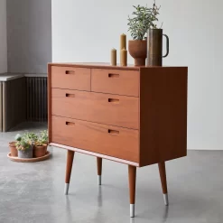 Découvrez notre commode Magda 50’s en bois d’acajou massif certifié FSC® provenant d’Indonésie. Meuble de rangement idéal, notre commode se compose de 2 petits tiroirs ainsi que de 2 grands tiroirs sur rails en métal dans lesquels vous pourrez ranger votre garde robe et linge de nuit.