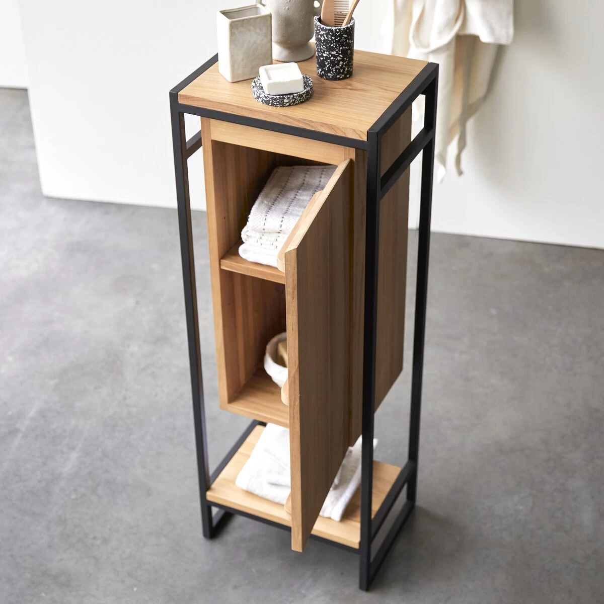 Apportez une touche contemporaine à votre salle de bain avec ce module de rangement Michal en métal et teck certifié FSC®. Son design urbain est caractérisé par ses lignes géométriques ainsi que par l’alliance du bois naturel et du métal noir pour un mariage élégant et graphique.