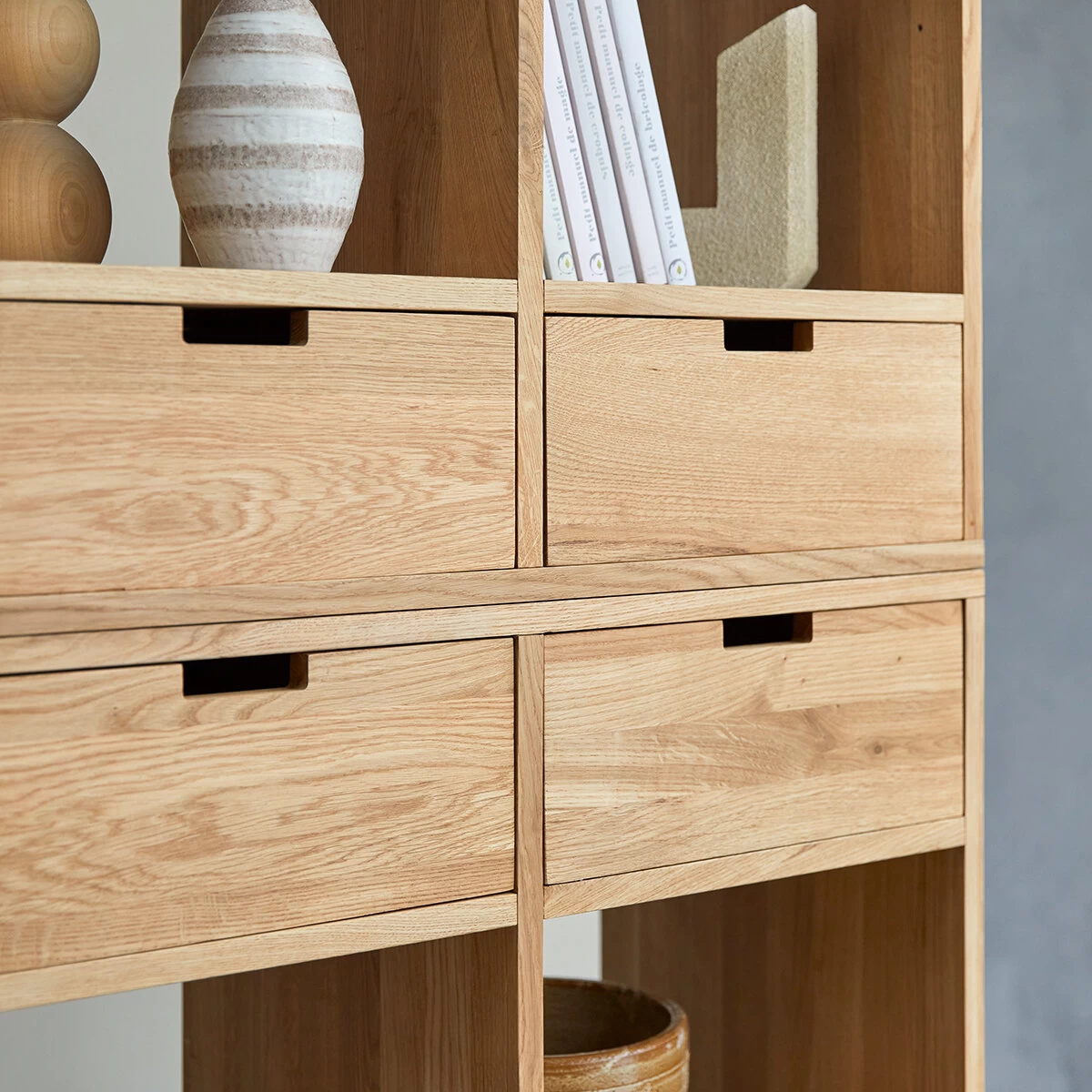 Offrant une belle capacité de rangement, la bibliothèque haute en chêne massif Miho est idéale pour mettre en beauté livres et objets déco. Véritable élément central de votre salon, elle s’installe aussi dans la chambre des parents ou des enfants (pour organiser jeux et jouets), dans le bureau ou dans une entrée spacieuse. Astucieuse, elle peut aussi composer une élégante séparation entre deux espaces dans une pièce : les tiroirs s’ouvrent des deux côtés de la bibliothèque. Au gré des besoins, les deux modules se superposent ou se juxtaposent pour devenir cloison amovible ou isoler un coin bureau dans le séjour, par exemple.