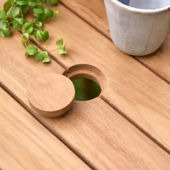 D’une élégance toute naturelle, la table de jardin en teck massif Mila accueille 6 convives au jardin ou sur la terrasse ! On aime son plateau lamellé aux douces tonalités miel, le trou central qui permet d’installer un parasol et qui se referme si on souhaite placer la table dans la véranda ou le jardin d’hiver. A noter, les pieds inclinés qui confèrent à l’ensemble une allure contemporaine.