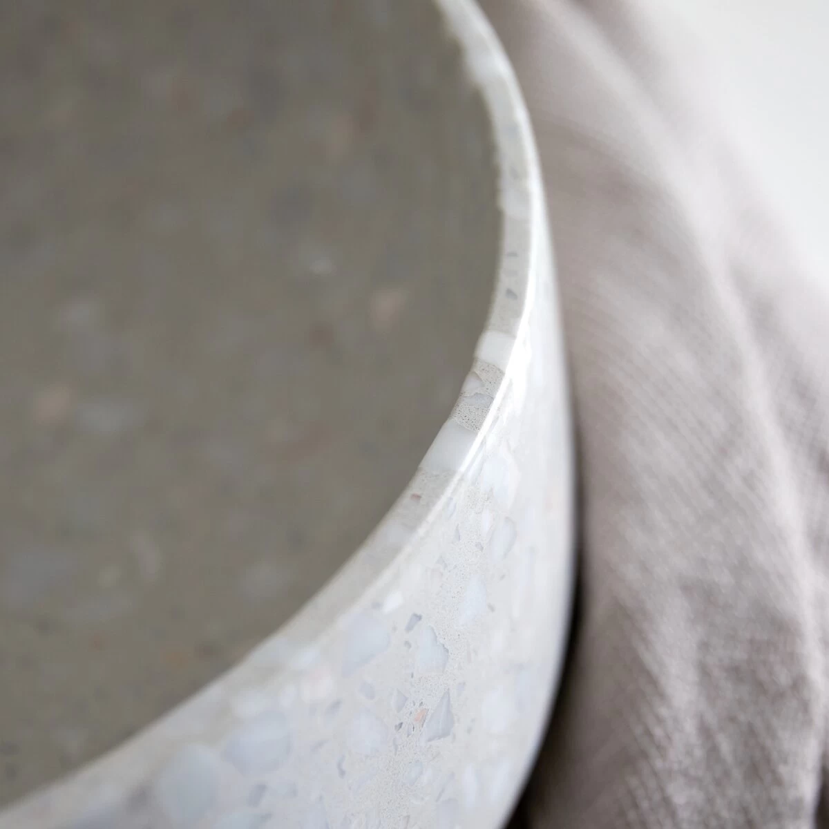 La vasque en terrazzo premium Milos, toute en rondeur et en douceur, offre le charme de la pierre naturelle et la facilité d’entretien d’un alliage bien pensé.