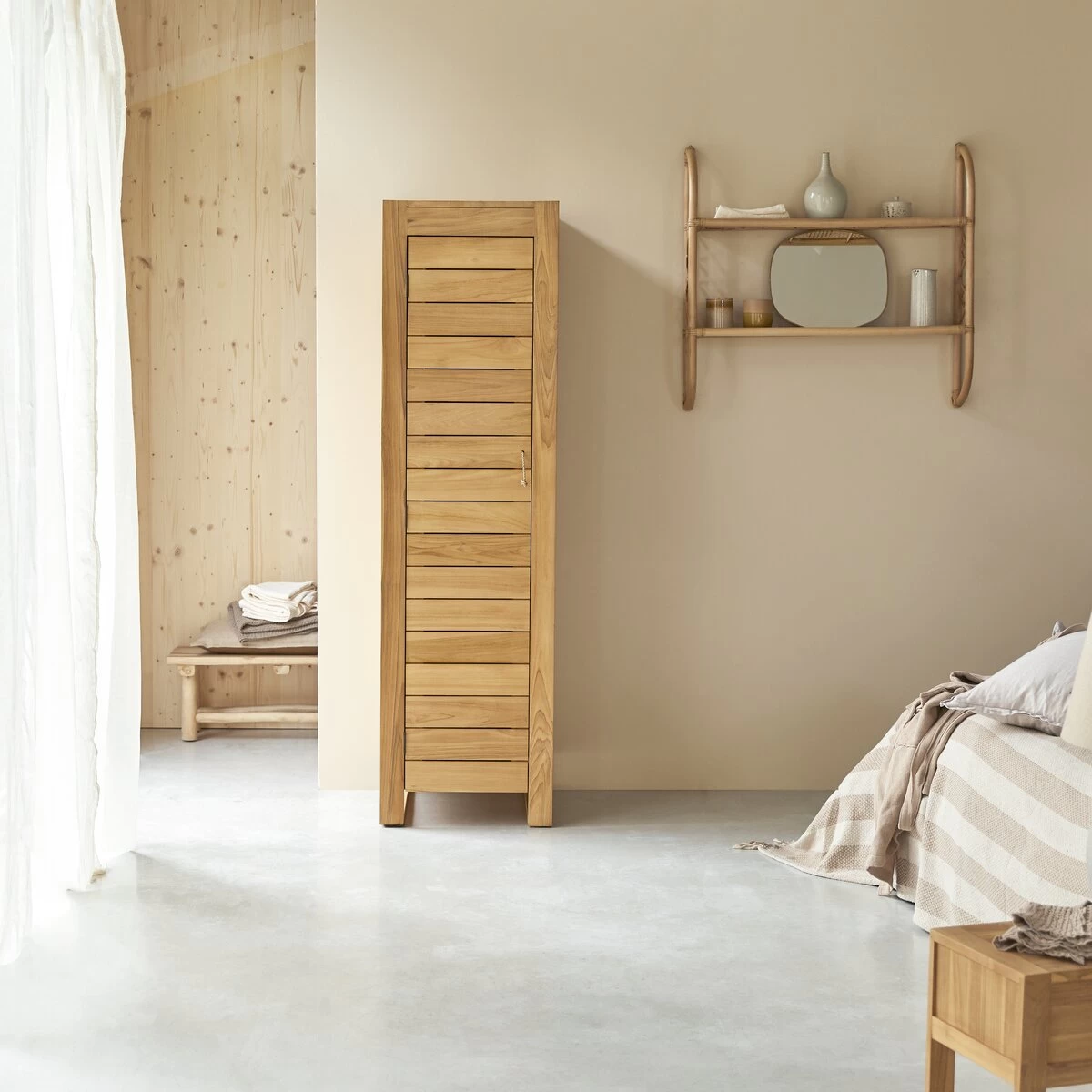Idéale pour organiser vos vêtements dans la chambre, la colonne MINIMALYS en teck massif certifié FSC® sait aussi se faire une place dans la salle de bain… La sobriété des lignes alliée à la douceur de la tonalité miel vous autorise toutes les associations : vous la combinerez au chevet et au lit MINIMALYS et dans la salle de bain, aux meubles sous vasque (largeur 90 cm ou largeur 145 cm). Vous pourrez aussi décider d’en placer deux dans la chambre des enfants pour séparer le linge d’une fratrie : de dimensions discrètes pour un généreux volume de rangement, elle s’installe partout !