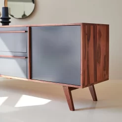 Ce buffet TV en palissandre monté sur des pieds obliques, est muni de multiples espaces pour y ranger toutes votre vaisselle et linge de table.