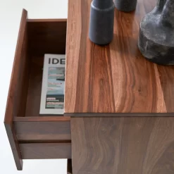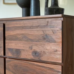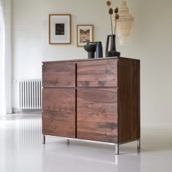 Travaillé dans un bois chamarré aux veinages apparents du plus bel effet, le bahut en palissandre massif Nova conjugue élégance naturelle et allure contemporaine. On aime son élégante sobriété, les pieds en inox qui allègent visuellement la ligne et la belle capacité de rangement. Idéal dans toutes les pièces de la maison, ce meuble reçoit au salon ou au séjour la vaisselle et le linge de table, dans la chambre les vêtements pliés et le linge de nuit, dans la salle de bain, serviettes, draps et autres accessoires de toilette ! Bien pratique, il offre deux larges compartiments + 2 tiroirs profonds.