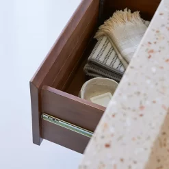 Beaucoup de caractère pour le meuble de salle de bain en palissandre massif Nova. Son plan vasque en terrazzo premium Pink du plus bel effet est très facile à entretenir au quotidien… et pour vous assurer un meuble qui traverse le temps sans ambages, ce meuble est protégé des éclaboussures d’eau par un vernis : un meuble qui vous accompagnera jour après jour sans prendre une ride ! Vous serez sensible à l’authenticité du bois aux tonalités mordorées soulignées d’un veinage apparent du plus bel effet et à la belle capacité de rangement assurée par 4 généreux tiroirs : l’idéal pour tout organiser dans la salle de bain.