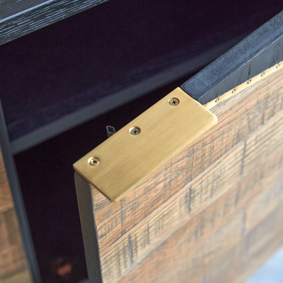 Banc multimédia ou meuble de rangement neo ethnique, il vous séduira à coup sûr : vous aimerez l’alliance du métal et du bois, le jeu de couleurs naturelles et le piétement aussi graphique que stable.