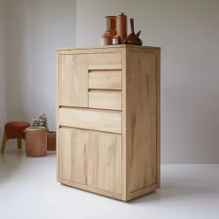 La teinte claire de son bois brut en fait un meuble tendance qui offrira à votre pièce luminosité et chaleur. Fonctionnel, ses nombreux rangements vous seront utiles pour l’organisation de votre intérieur. Dans la cuisine, il vous permettra de disposer votre plus belle vaisselle et tous vos outils de travail.