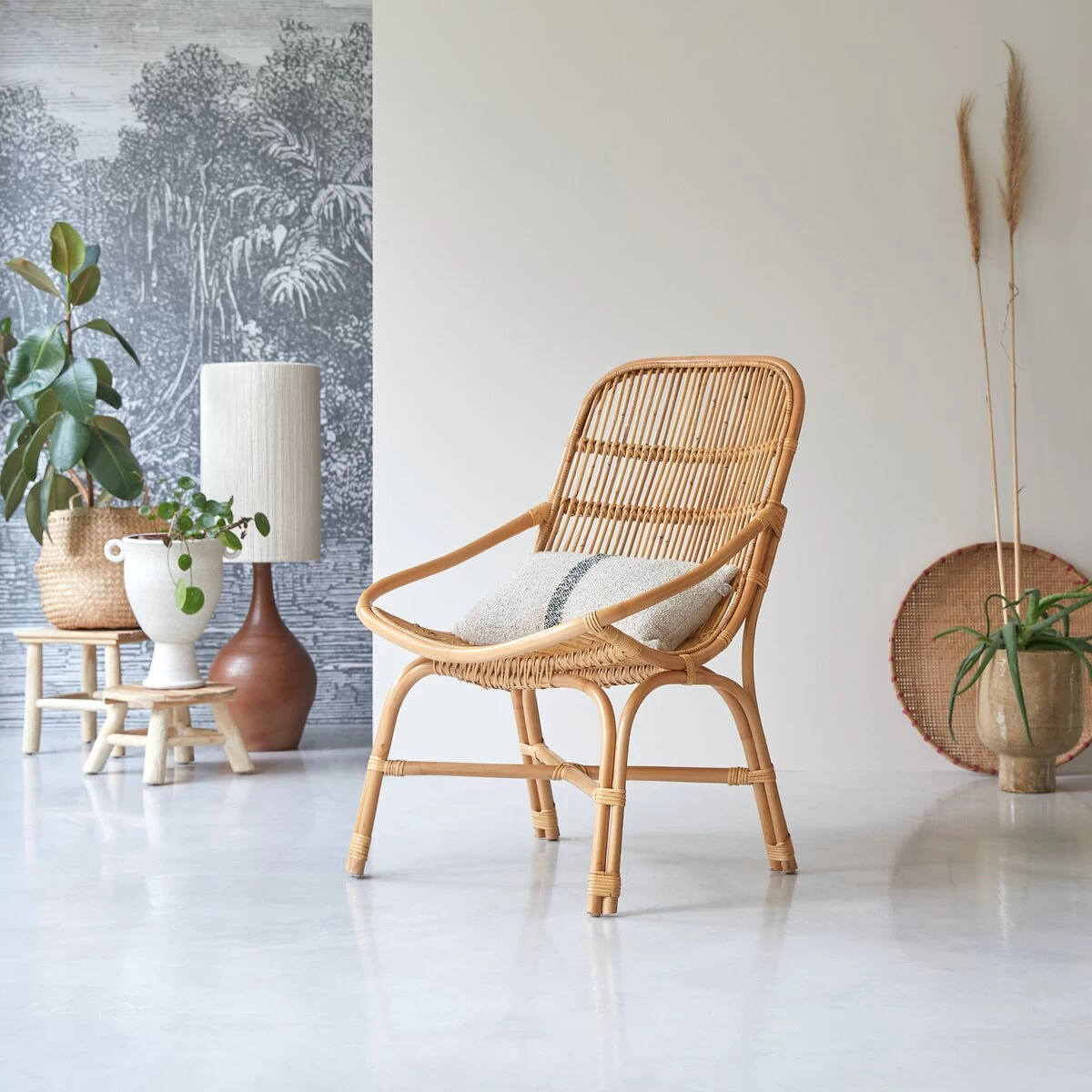 La configuration en tiges de rotin de ce fauteuil Pia, lui procure un style inégalée tout en charme et en authenticité.