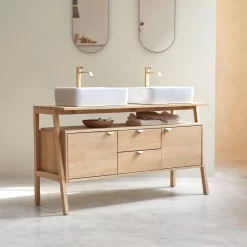 Le meuble sous vasque en chêne Pola permet de recevoir deux vasques à poser dont nous vous proposons un large choix. Il existe aussi en version simple : le meuble sous vasque en chêne Pola 90.