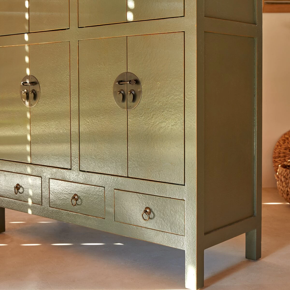 D’inspiration lointaine, l’armoire de rangement en pin Qing est une véritable invitation au voyage… sans quitter la maison. On est séduit par sa généreuse capacité qui permet d’organiser toute la vaisselle de la maison et le linge de table. Les couverts ou tous ces petits éléments qu’on ne veut pas voir traîner dans la pièce trouvent naturellement leur place dans les 3 tiroirs. Aussi à l’aise au séjour qu’à la cuisine, cette très belle armoire chinoise s’installe avec la même réussite dans le salon ou la chambre à coucher. Elle confère à chaque pièce qu’elle habille une atmosphère exotique propice au dépaysement. A noter les très belles poignées en laiton.