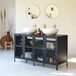 Idéal pour moderniser une salle de bain qui manque un peu de personnalité ou pour composer une déco indus dans toutes les pièces de la maison… du séjour à la pièce d’eau ! Présenté ici associé à une vasque à poser en céramique, il s’harmonise avec autant de réussite à une vasque en marbre ou une vasque en terrazzo. A noter, la belle capacité de rangement qui permet de tout organiser dans la salle de bain.