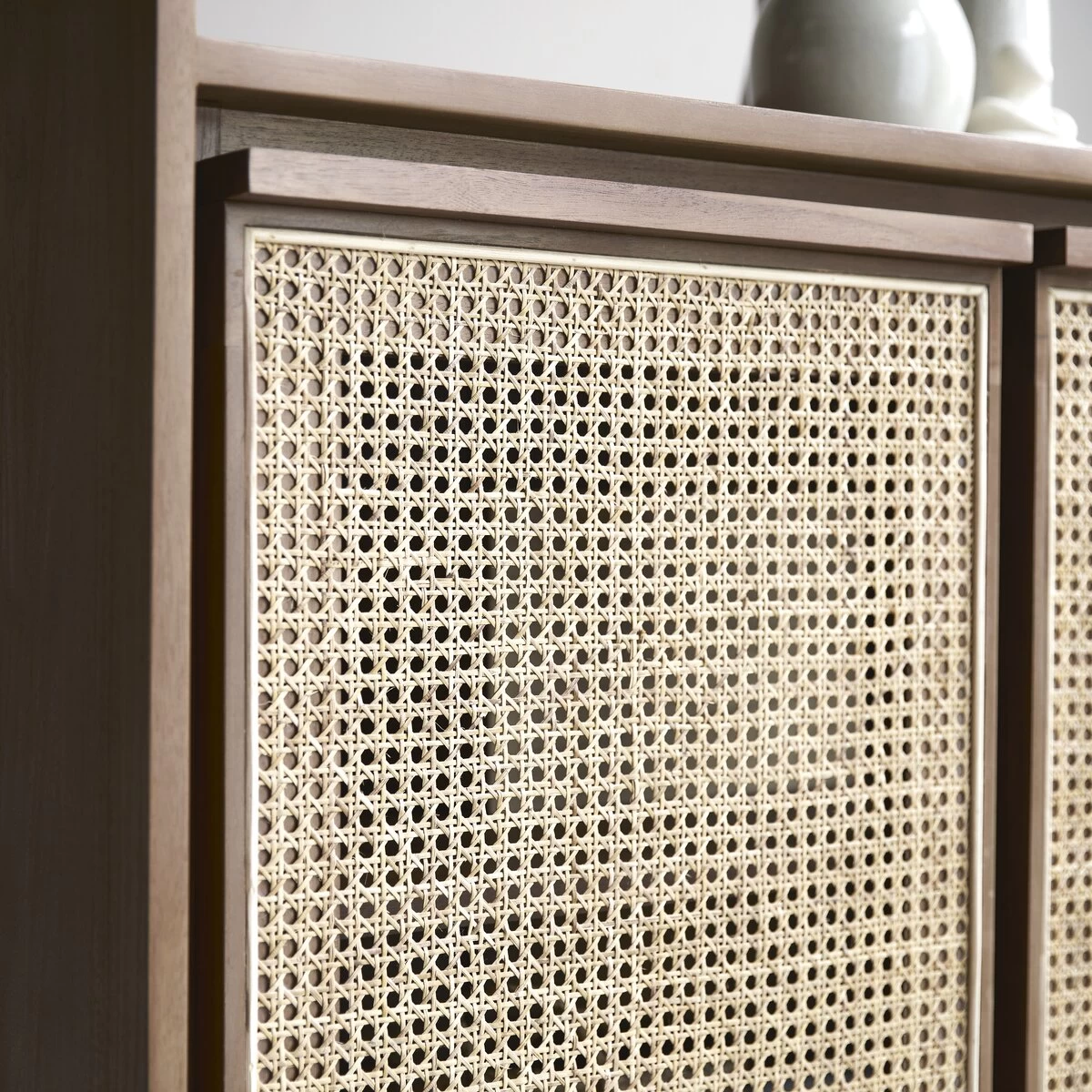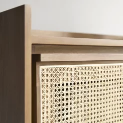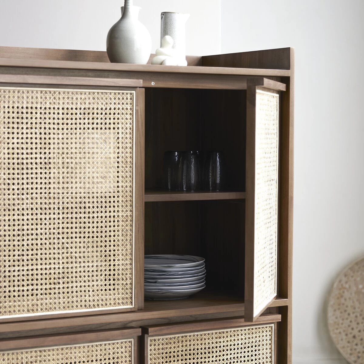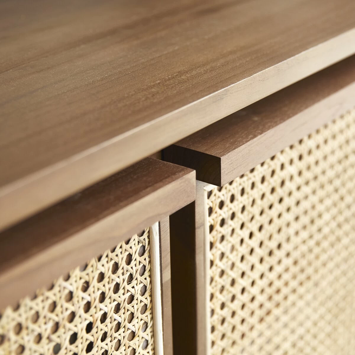 Le cannage, désormais présent dans nos intérieurs contemporains, ne cesse de se réinventer : le bahut en teck massif Roots en propose une version moderne en l’associant à un bois foncé… la blondeur de l’un rehausse l’intensité de l’autre.