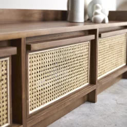 Un design singulier pour le banc TV en teck massif Roots : on aime l’alliance du cannage raffiné et du bois foncé qui métamorphose un simple meuble TV en une pièce contemporaine de caractère !