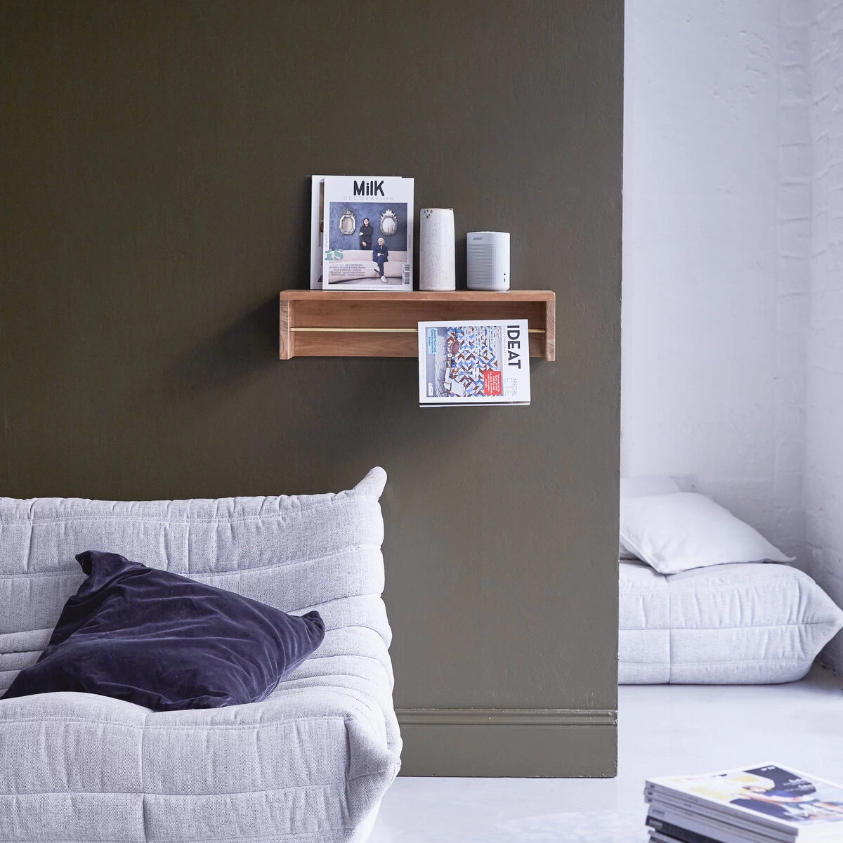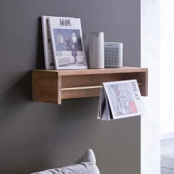 Côté pile, l’étagère murale en teck massif certifié FSC® et laiton Sasha 60 reçoit bibelots, livres et autres bougies et vases… côté face, les revues, magazines, journaux qu’on aime avoir à portée de main. Retournez-la, elle devient mini bibliothèque ou étagère classique.
