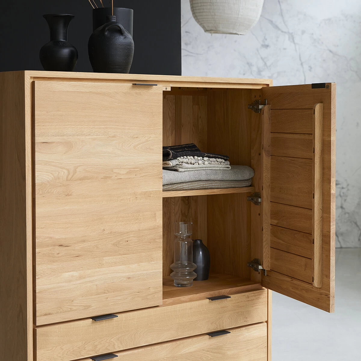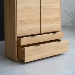 Réalisée en chêne massif certifié FSC®. Huilée pour protéger le bois tout en laissant s’exprimer sa beauté naturelle. De belle capacité, cette armoire de forme bloc est sertie d’un cadre fin pour en alléger visuellement l’effet.