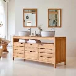Ce large meuble de salle de bain en bois de chêne, conçu pour accueillir deux vasques en pierre, s’avèrera très pratique avec ses multiples rangements .