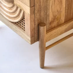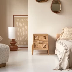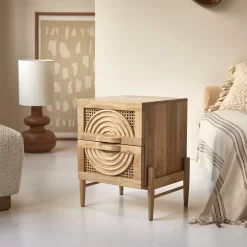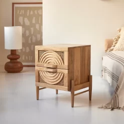 Le chevet Sina en manguier massif et rotin conjugue originalité et inspiration néo-ethnique. La façade, en réalité deux tiroirs bien pratiques pour ranger lunettes, magazines, télécommandes et tous ces objets qu’on aime avoir à portée de main… offre un très beau décor en bois et cannage : les deux tiroirs fermés composent alors l’ornement complet. Idéal associé à nos têtes de lit en rotin, ce chevet complète avec brio une chambre aux accents bohèmes. Il peut aussi composer la petite touche d’originalité dans une chambre plus classique : la blondeur de son bois autorise de nombreuses associations mais si vous aimez sa personnalité venue d’Ailleurs, n’hésitez pas à lui associer d’autres meubles de notre collection Sina, comme la commode ou le banc TV.