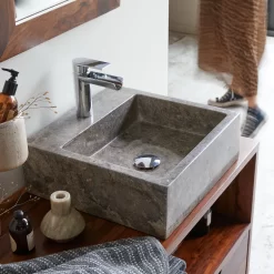 La vasque en marbre Slats Grey, à poser ou à encastrer, en fait une évidente démonstration. Son matériau authentique, raffiné et très actuel se marie à la perfection à votre meuble de salle de bain existant, quel qu’en soit le style…
