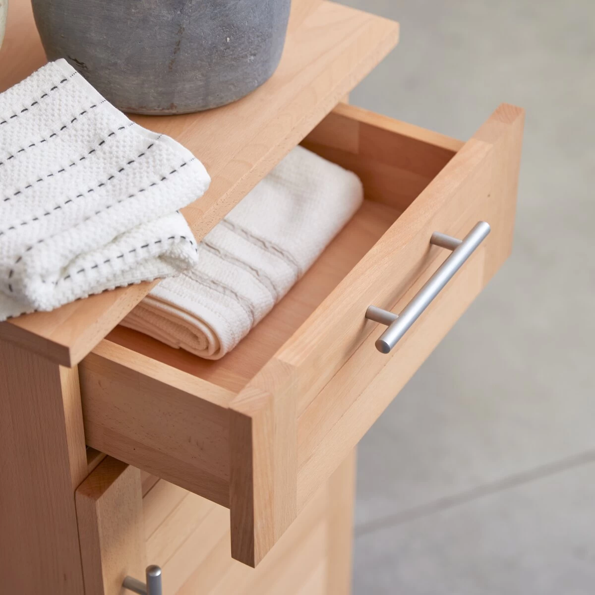 L’élément bas en hêtre massif Soho complète avec talent notre gamme de salle de bain en hêtre massif Soho. Il vous est également proposé dans une version teck massif et une version chêne massif.