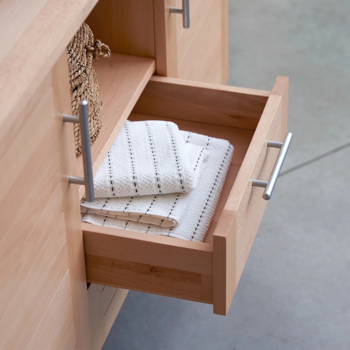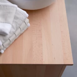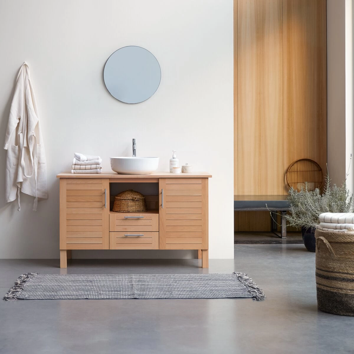 Elégance naturelle et belle sobriété de lignes : le meuble de salle de bain en hêtre massif Soho a vraiment tout pour vous séduire : on aime la blondeur de son bois, certifié FSC® (l’assurance qu’il provient de forêts durablement gérées), sa belle capacité de rangement et la finition lattée très en vogue dans les intérieurs contemporains. Idéal pour tout ranger dans la salle de bain, le meuble en hêtre massif Soho permet de recevoir une ou deux vasques en terrazzo, céramique ou marbre… Il vous est également proposé en version 165 cm pour une salle de bain spacieuse et en 85 cm, l’idéal pour une petite salle d’eau ou un cabinet de toilette. Finition huilée pour traiter le bois et le protéger en profondeur.