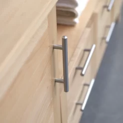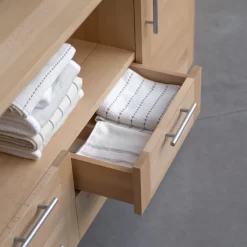 Le meuble de salle de bain en hêtre massif Soho conjugue élégance naturelle et généreuse capacité de rangement. Travaillé dans un bois clair, il est lumineux et s’adapte à toutes les déco. Bien conçu, il permet de ranger efficacement le linge de toilette, les accessoires et les produits de beauté. Parfait pour une famille, il offre un large plan qui permet de poser 2 vasques en terrazzo, en céramique ou en marbre.