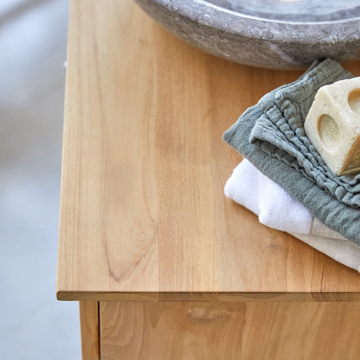 Elégance naturelle et charme intemporel pour le meuble de salle de bain en teck massif Soho. Son design minimaliste est relevé d’une très belle conception lattée, très en vogue dans les intérieurs contemporains. Conçu pour durer, il accompagne votre quotidien sans jamais se démoder. On aime sa judicieuse capacité de rangement qui lui permet d’accueillir le linge de toilette et les accessoires… et les poignées en métal brossé du plus bel effet. Idéal pour recevoir une vasque à poser que vous choisirez selon votre goût et votre budget – terrazzo premium, céramique, marbre, pierre… , il peut être complété de la colonne en teck massif Soho assortie.