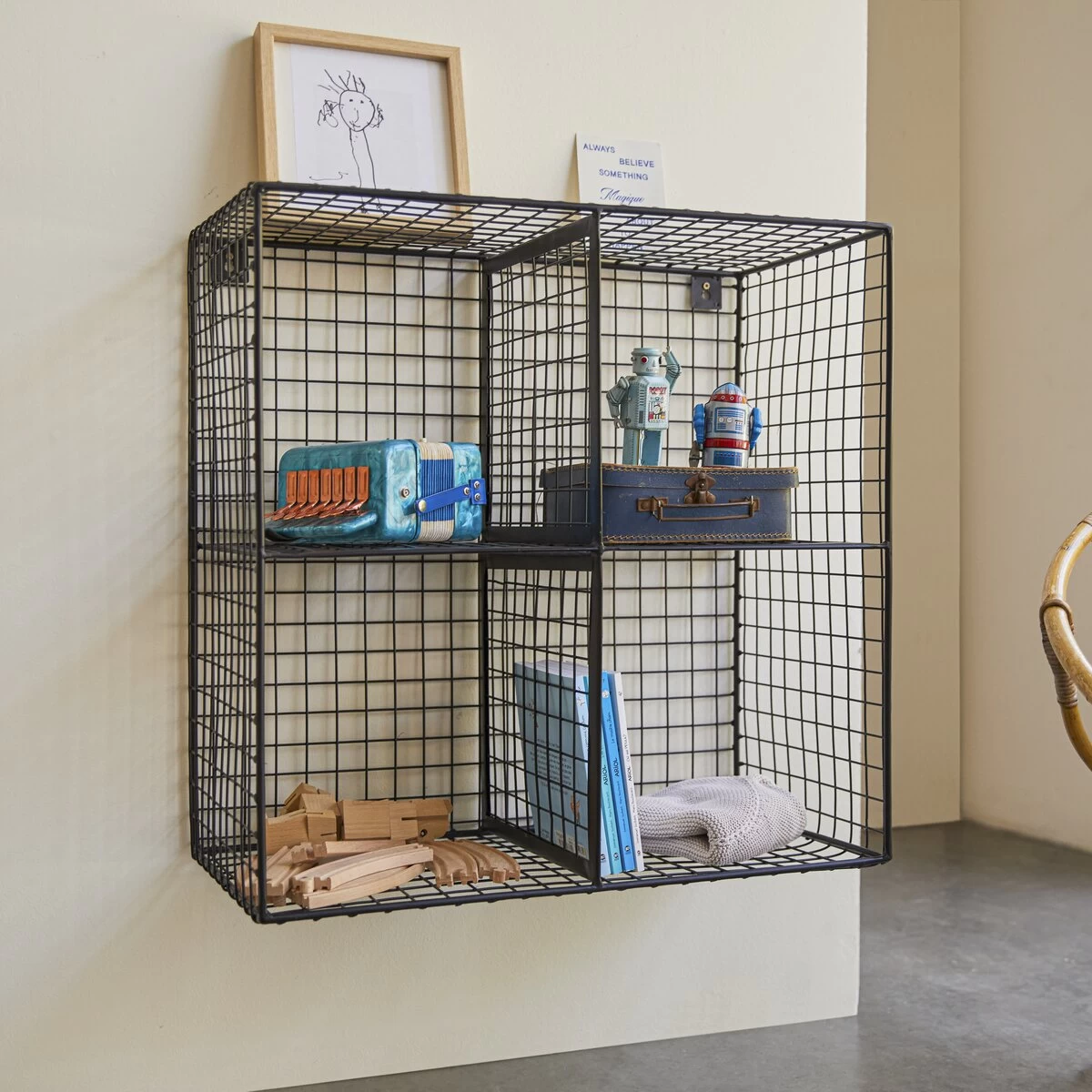 Quand la chambre se transforme en salle de jeux… Le rangement en métal Sona ouvre la voie à tous les rêves (même éveillés !) : accroché ou posé au sol, il est un chevet qu’on imagine panier de basket, une bibliothèque dans la caserne des pompiers ou un support pour l’exposition de ses jouets ou créations préférées !