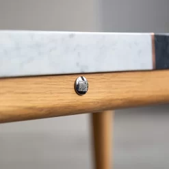 On aime l’originalité de son plateau graphique qui joue le contraste des marbres de couleur différentes (blanc + vert) rehaussé de touches de cuivre… et son piétement en chêne massif brut aux lignes adoucies.