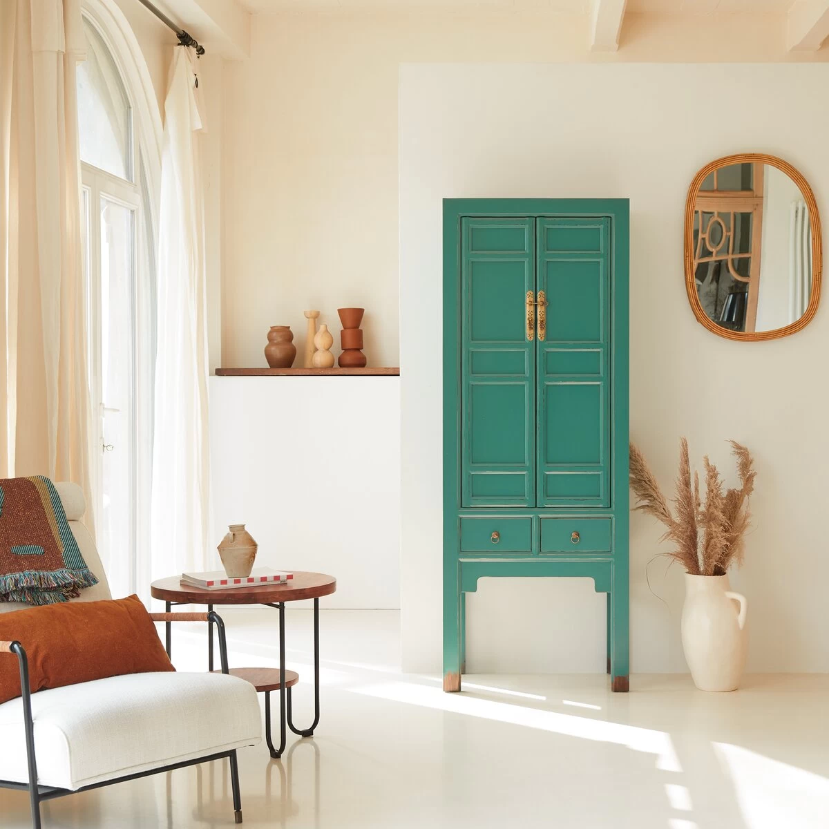 L’armoire de rangement en pin 190 Suï cultive l’envie d’horizons lointains ! On aime son allure néo ethnique pile dans l’air du temps, sa ligne effilée, sa belle capacité de rangement et ses détails qui font toute la différence : une fermeture très travaillée et des poignées en laiton, un élégant piétement, des portes à moulures et une finition laquée.