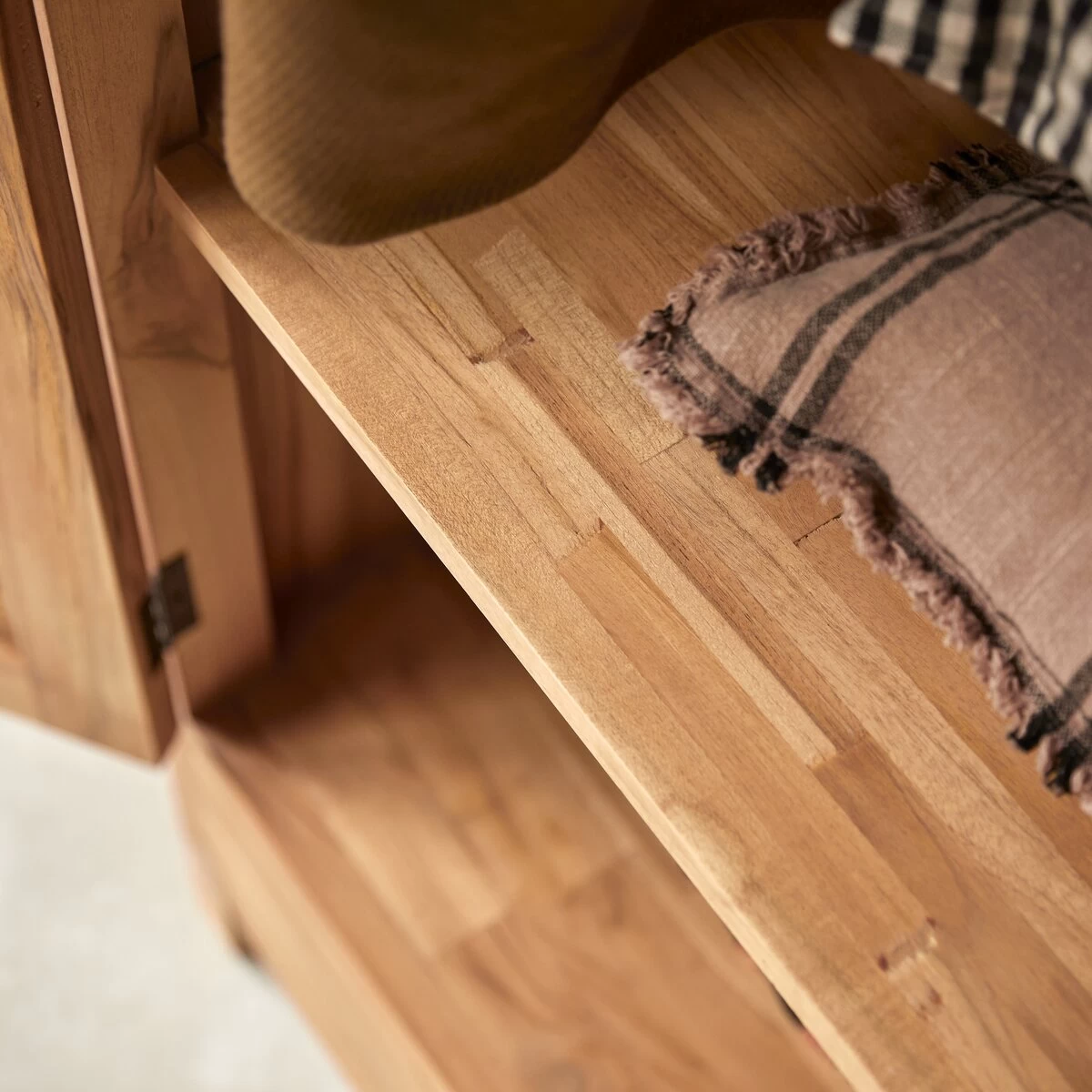 Raffinement et élégance : notre armoire en teck certifié FSC® Suzette saura vous ravir, elle trouvera aisément sa place dans votre chambre ou votre salon. Amateur de bois massif naturel, vous serez conquis par l’authenticité de son bois brut.