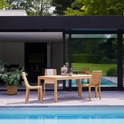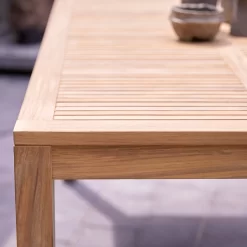 Le salon de jardin en teck massif Teo. Le charme du lamellé très tendance dans la déco contemporaine, la blondeur d’un bois aussi à l’aise à l’intérieur qu’à l’extérieur… voici un salon de jardin qu’on installe avec plaisir sur la terrasse pour de belles heures de convivialité à la belle saison et qu’on détourne en meubles d’intérieur pour le séjour, le coin repas ou le jardin d’hiver. Vendue ici avec 4 chaises assorties, la table accueille jusqu’à 8 convives : l’idéal pour les grandes familles ou les soirées entre amis !