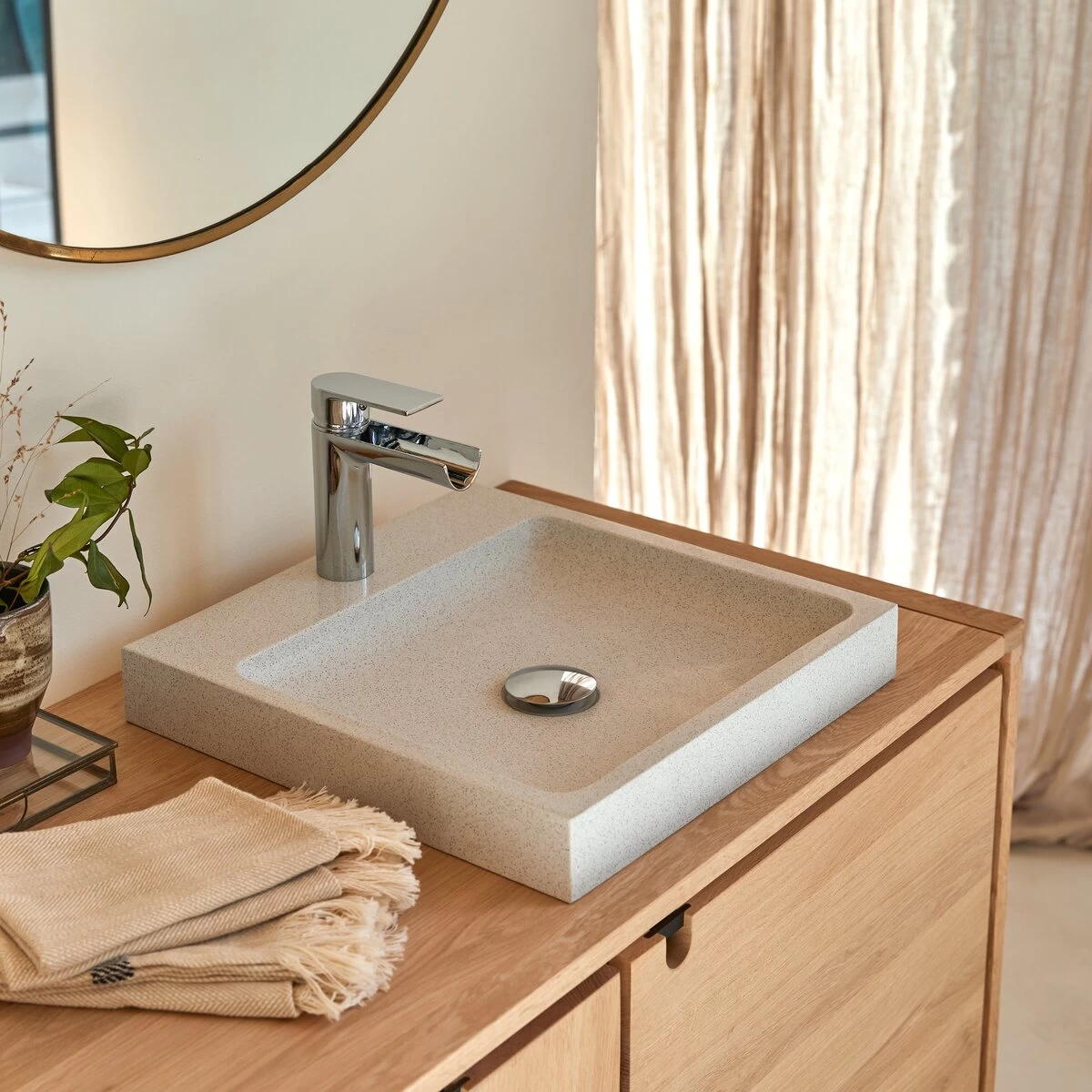 Minimaliste et raffinée, la vasque carrée Timon en terrazzo premium White conjugue avec talent matériau haute qualité et ligne contemporaine. Idéale dans la salle de bain ou la salle d’eau, elle est aussi parfaite pour aménager un coin toilette dans une chambre ou un lave-main dans les sanitaires. Pleine de charme, elle finit avec à-propos tout type de mobilier de salle de bain : la sobriété de sa ligne autorise de nombreuses associations de style. Travaillée dans une matière très résistante, la vasque carrée Timon en terrazzo premium White est facile à vivre au quotidien !