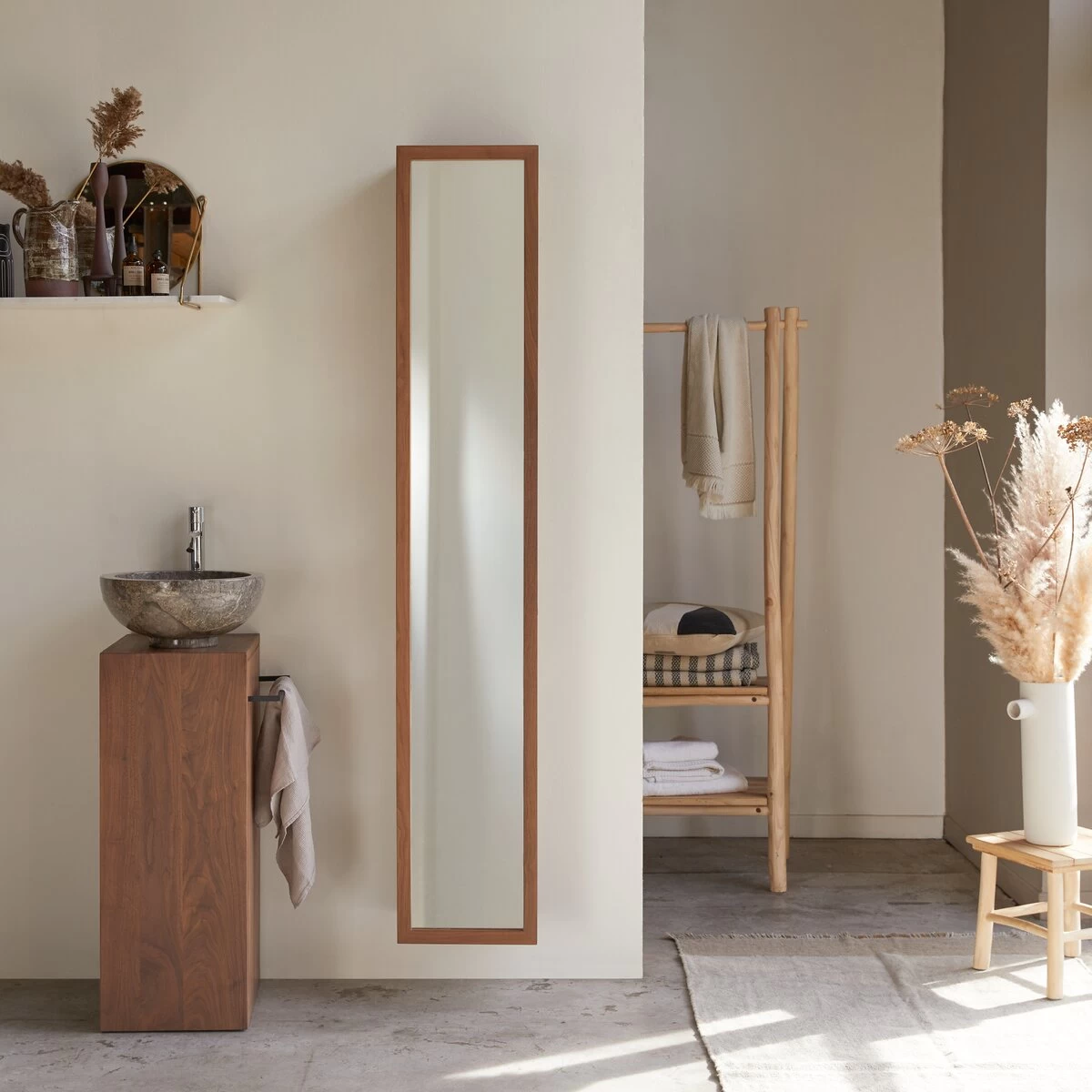 La colonne en noyer massif Twig : une 2 en 1 qui offre de belles lignes contemporaines et un minimalisme intemporel. Très pratique, sa double fonction vous permet de combiner miroir et rangement en un seul espace. Appréciable dans une petite salle de bain ou lorsqu’on veut compléter l’agencement d’un cabinet de toilette ! Le grand miroir permet de se voir en pied… ce qui l’autorise à être installé aussi dans l’entrée ou le dressing. Les rangements sont très discrets, appréciable selon l’endroit où vous installez la colonne ! Le bois certifié FSC®, a reçu un traitement à l’huile pour le protéger des éclaboussures et de l’usure.