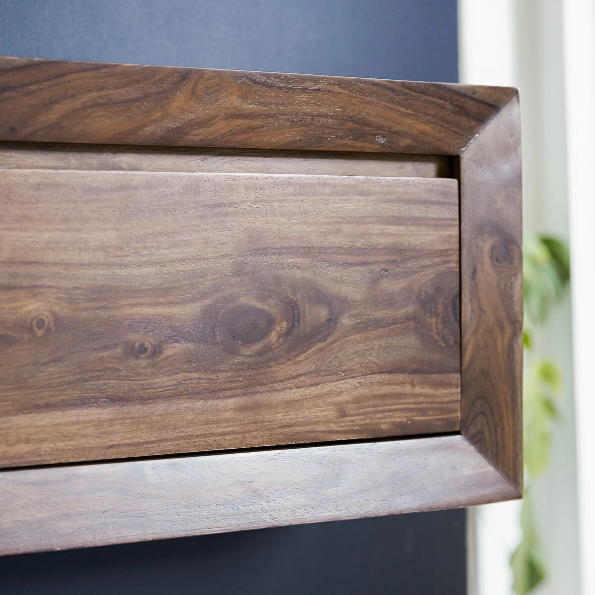 Elégance contemporaine et beauté naturelle d’un bois précieux aux veinages contrastés du plus bel effet… la console murale en palissandre massif Villa fait entrer un vent de modernité dans votre quotidien. Sa forme minimaliste et sa beauté naturelle en font une pièce essentielle de votre déco. Idéale au salon pour organiser magazines et autres éléments qu’on ne veut pas voir trainer, elle trouve aussi tout naturellement sa place au séjour pour accueillir le linge de table ou la vaisselle, dans une entrée spacieuse pour ranger écharpes et chapeaux… dans la chambre ou le bureau, au gré de vos envies ou de vos besoins. Esthétique, elle permet un gain de place appréciable puisqu’elle est suspendue et ne demande pas d’espace au sol.